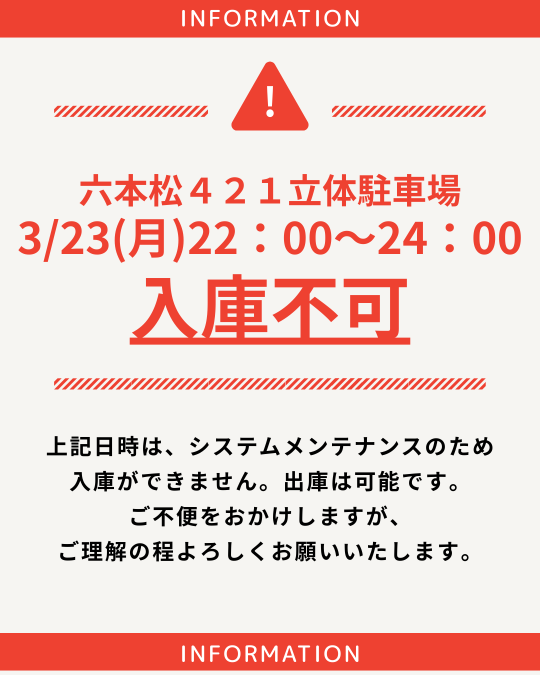 【重要】3/23(月)22:00~24:00立体駐車場入庫不可のお知らせ
