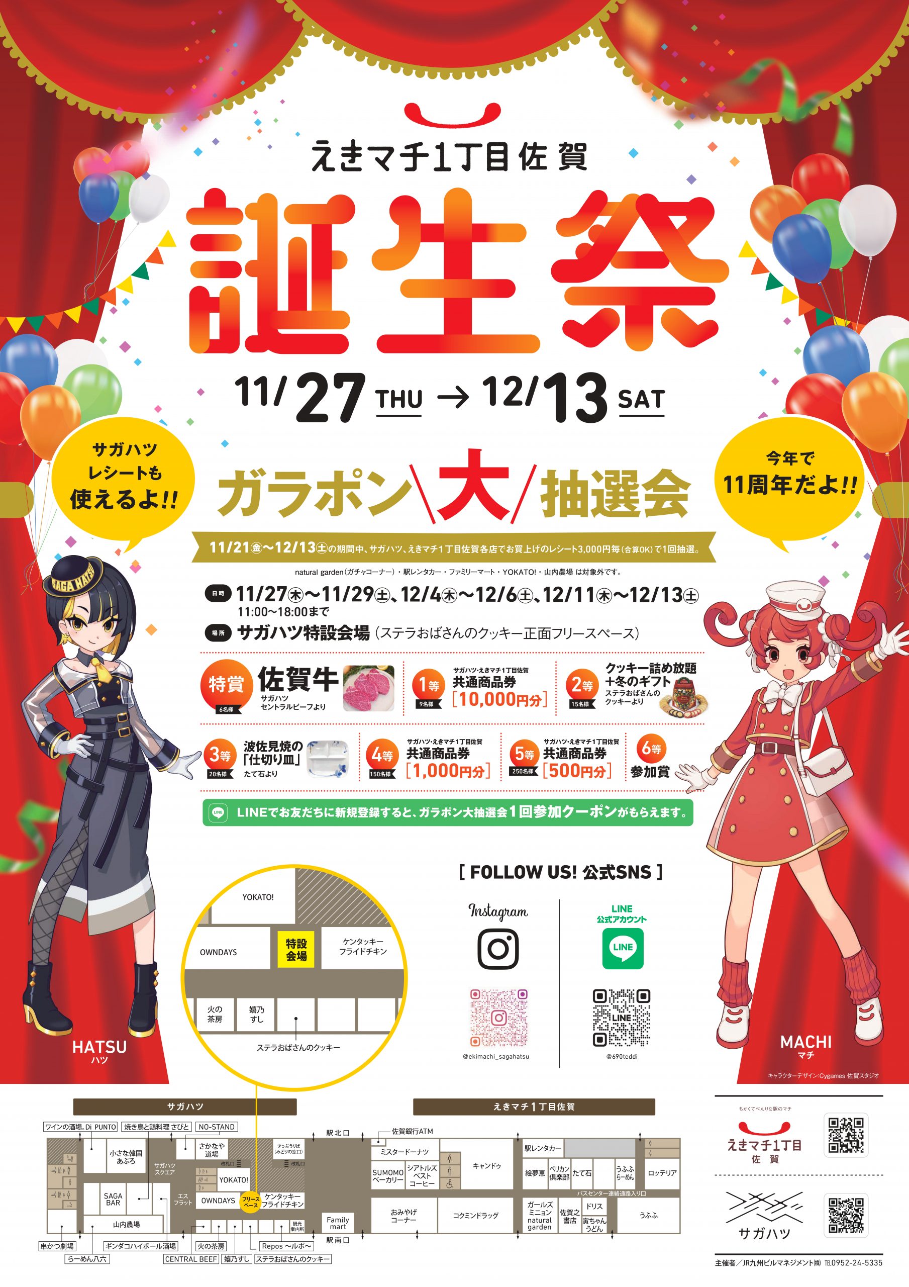 いつもサガハツ・えきマチ1丁目佐賀をご利用頂き誠にありがとうございます。 今年も皆さまへの日頃の感謝を込めて、ガラポン抽選会を実施します! ぜひお楽しみください⭐ 【ガラポン抽選会】 ■日時:①11/27〜11/29 ② … 続きを読む ★えきマチ11周年抽選会開催★