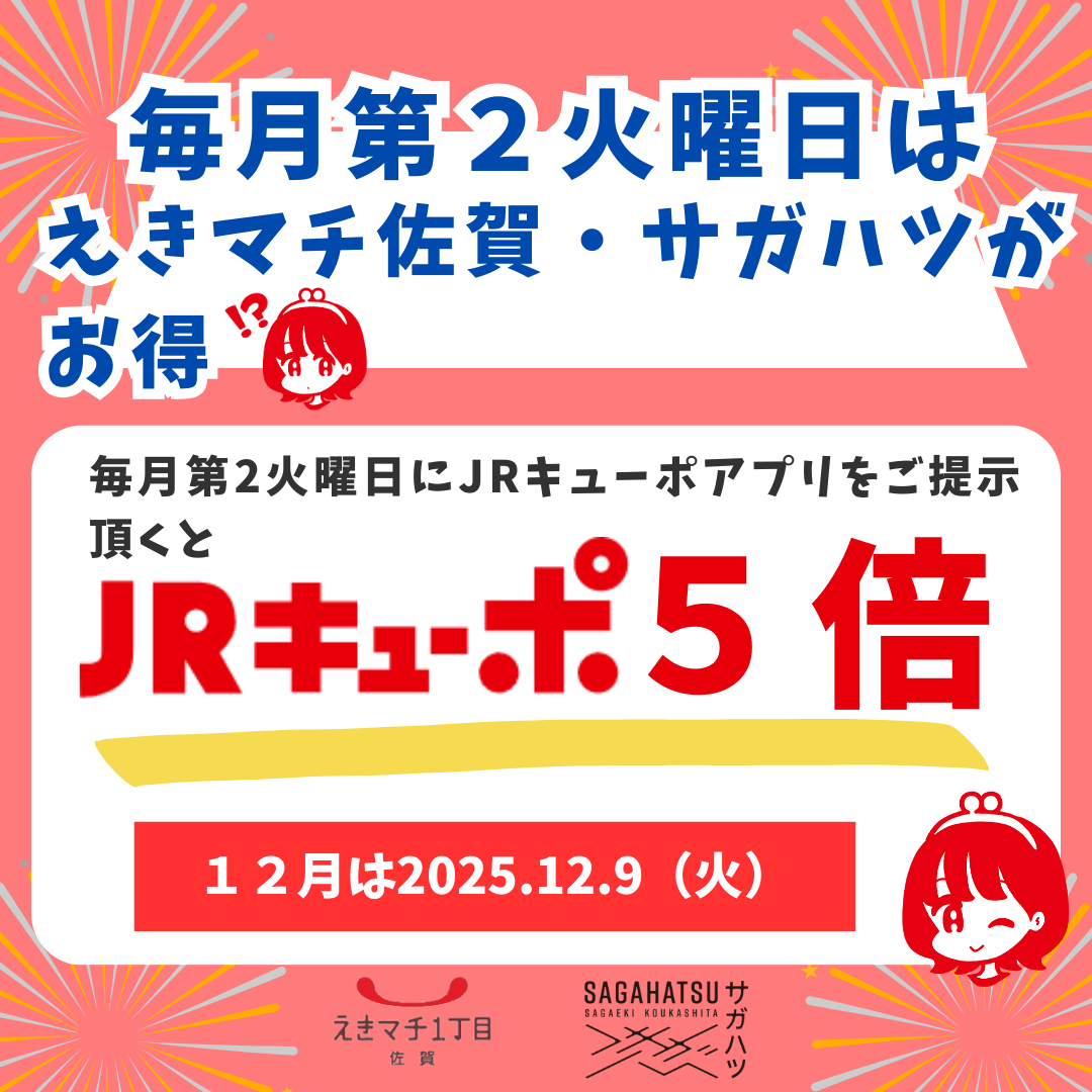 えきマチ1丁目佐賀・サガハツでは毎月第2火曜日にJRキューポ5倍キャンペーンを実施いたします!